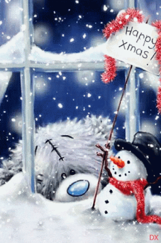 A heartwarming animated scene featuring a teddy bear and a snowman wishing 'Happy Xmas!' amidst falling snow.