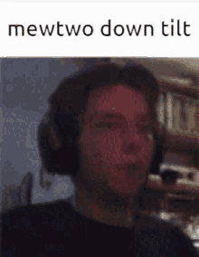 A man wearing headphones reacts to "Mewtwo Down Tilt" text, likely a gaming reference.