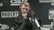 Machine Gun Kelly (MGK) in a radio interview, wearing headphones and a leather jacket.