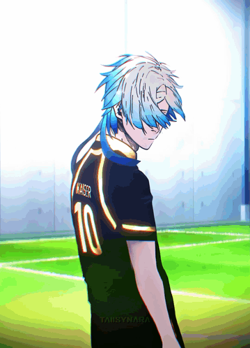 Michael Kaiser from Blue Lock, wearing his number 10 jersey, turns and gives a confident smile on the soccer field.