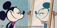 Mickey Mouse looks at his reflection in a mirror, declaring, 'Mickey Mouse, you are one lucky guy!'