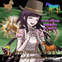 Mikan Tsumiki from Danganronpa 2 in a cowboy hat, surrounded by horses, with text about freedom.