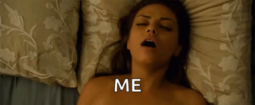 Mila Kunis with 'ME' text overlay, lying on a bed with eyes closed and an intense expression.