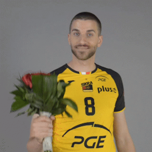 Volleyball player Milan Katić from PGE Skra Bełchatów smiles while holding a bouquet of red roses.
