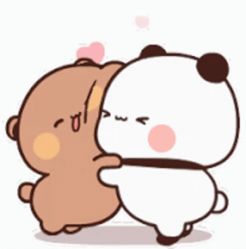 Mimi and Bubu, the cute cartoon bears, share a loving hug with hearts floating around them.