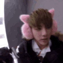 Seokjin, also known as Jin, from Mincarti, dancing adorably while wearing pink cat ear earmuffs.