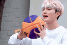 Mirae Yubin, a young man with light hair, holds a colorful basketball with a focused expression.