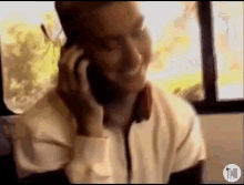 Justin Timberlake from *NSYNC smiles while talking on an old cell phone, capturing a 90s pop culture moment.