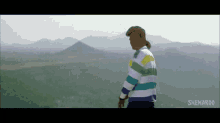 Bollywood actor Mithun Chakraborty, also known as Mithunda, stands on a scenic hilltop with mountains in the background, wearing a striped shirt.