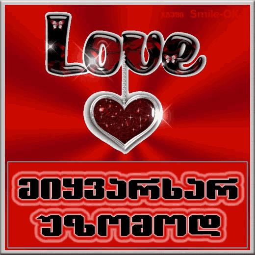 A vibrant red background featuring the word 'Love' and a heart pendant, with Georgian text 'მიყვარხარუზომოდ'.