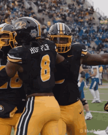 Mizzou football players celebrate on the field, showing team spirit and camaraderie after a play.