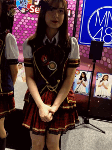 MNL48 member Rans waves to the camera in front of an MNL48 sign at an event.
