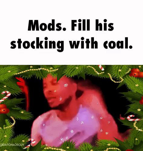LTG (LowTierGod) in a Christmas-themed meme, with the caption 'Mods. Fill his stocking with coal.'