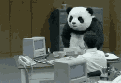 A person in a panda costume pranks an office worker, knocking over a trash can in a humorous office scene.
