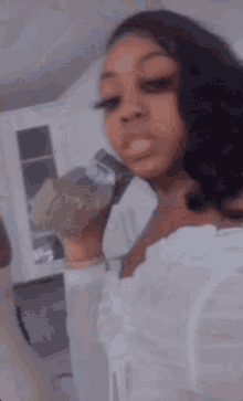 A sassy woman holds up a large stack of cash, showing off her money with confidence.