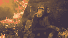 A chimpanzee sits on a tree branch, looking up and around with a reddish-orange glow in the background.