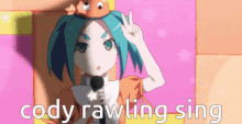 An anime girl from Monogatari with blue hair sings into a microphone, with 'cody rawling sing' displayed.