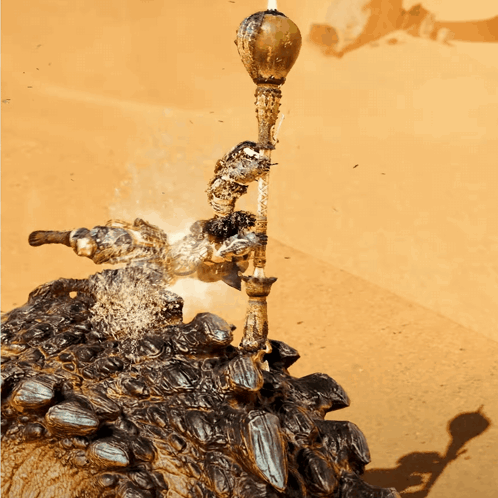 A large, armored monster is attacked by a hunter using an insect glaive, creating a dynamic splash effect.