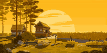 A beautiful pixel art landscape by IVANZELIR, featuring a golden sunset over traditional houses and wheat fields.