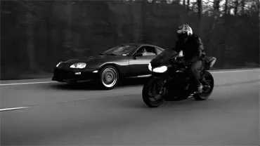 A motorcyclist performs an impressive wheelie while riding next to a black car, possibly a Toyota Supra, on a highway.