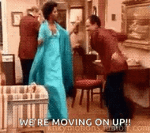 George and Louise Jefferson dance to 'Moving On Up' from The Jeffersons theme song in their living room.