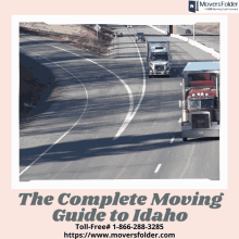 A complete guide to moving to Idaho, featuring moving trucks on a highway and contact information for services.