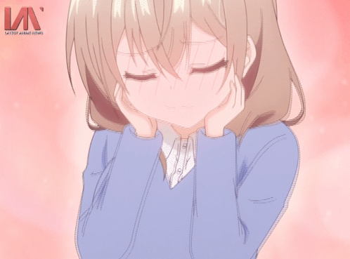 Shiori Katase from My Tiny Senpai blushes shyly, holding her face in an adorable moment.
