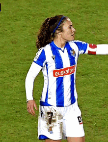 Nahikari Garcia, a female soccer player, stands on the field in her blue and white "euskaltel" jersey, looking focused.