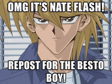 Anime character Nate Flash (Joey Wheeler) with a thumbs-up and then a wide grin, encouraging reposts for the 'besto boy'.