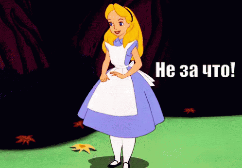 Alice from Alice in Wonderland gracefully curtsies and says 'You're welcome!' in a charming animated scene.