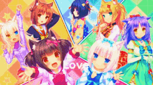 Colorful Nekopara anime characters, catgirls, posing together with 'Love' text in a vibrant scene.