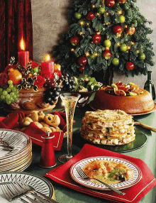 A beautifully set table for a festive Christmas and New Year's dinner, complete with a decorated tree and delicious food.