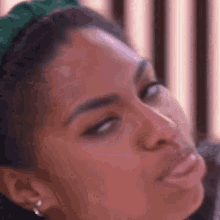 Nia Correia, the Spanish singer, makes a playful face, sticking her tongue out with a green headband.