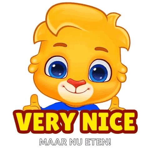 A character from Lucas and Friends gives two thumbs up with 'VERY NICE' and 'BUT NOW EAT!' captions.