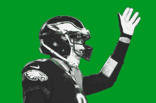 Nick Foles, wearing a Philadelphia Eagles uniform, waves his hand against a green screen background.