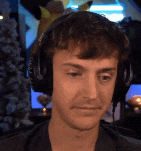 Popular streamer Ninja makes a funny and exaggerated facial expression while wearing headphones, likely during a Fortnite stream.