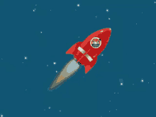 A red rocket featuring the Ninjacoin Cryptoninja logo blasts off into a starry blue space.