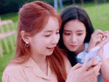 Niziu Rima and Maya smile while looking at a phone together, with Rima wearing a heart-shaped earring.