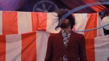 A man from No Monster Club performs a hula hoop act in a circus-themed setting.