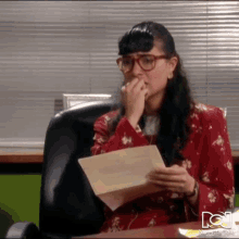 Beatriz Aurora Pinzon Solano (Ana Maria Orozco) reacts with distress and then a slight smile while reading a letter.