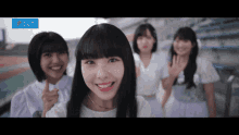 Ocha Norma's Nishizaki Miku smiles and poses with fellow group members in front of an Up-Front Works sign.