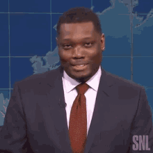 Michael Che laughs and shakes his head during a segment on Saturday Night Live's Weekend Update.