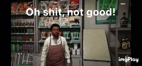 A man in an apron in a convenience store reacts with the text 'Oh shit, not good!' overlay.