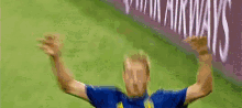 Ola Toivonen and a teammate celebrate on the soccer field after scoring a goal, showing intense excitement.