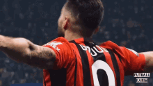 Olivier Giroud celebrates passionately after scoring a goal for AC Milan, wearing his red and black jersey.