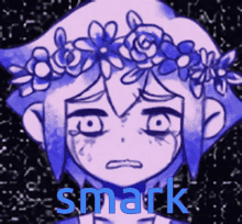 Omori Basil, wearing a flower crown, looks scared with tears, featuring the text 'smark'.