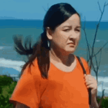 A woman, possibly Lilet, Gloria, or Nanay, stands by the ocean in an orange shirt, looking thoughtful.