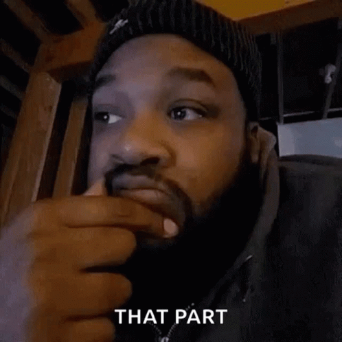A man with a beard and beanie reacts with a thoughtful expression to the phrase 'That Part'.