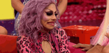 Yara Sofia, a drag queen from RuPaul's Drag Race All Stars, is seen crying with purple hair and a pink leopard print dress.