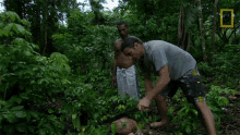A man demonstrates a survival skill by opening a coconut in the jungle for the show Primal Survivor.